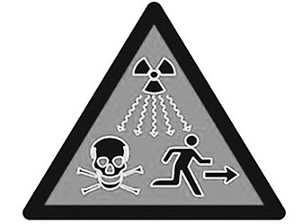 新標(biāo)志為黑框紅底三角,內(nèi)有一個輻射波標(biāo)記、一個骷髏頭標(biāo)記和一個逃跑的人形。