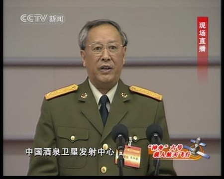 陳炳德:在這舉世矚目、激動人心的重要時(shí)刻,請?jiān)试S我首先介紹一下前來視察指導(dǎo)的黨和國家領(lǐng)導(dǎo)人,親臨北京航天飛行控制中心視察指導(dǎo)的有:中共中央總書記、國家主席、中央軍委主席胡錦濤同志,中共中央政治局常委、國家副主席曾慶紅同志,中共中央政治局常委、國家政協(xié)主席賈慶林同志,中共中央政治局常委、中央紀(jì)委書記吳官正同志。親臨酒泉衛(wèi)星發(fā)射中心的有,中共中央政治局常委、國務(wù)院總理溫家寶同志,中共中央政治局常委李長春同志,中央政法委書記羅干同志,中央政治局委員、中央軍委副主席、國務(wù)委員曹剛川同志,還有全國人大、國務(wù)院、全國政協(xié)的領(lǐng)導(dǎo)。